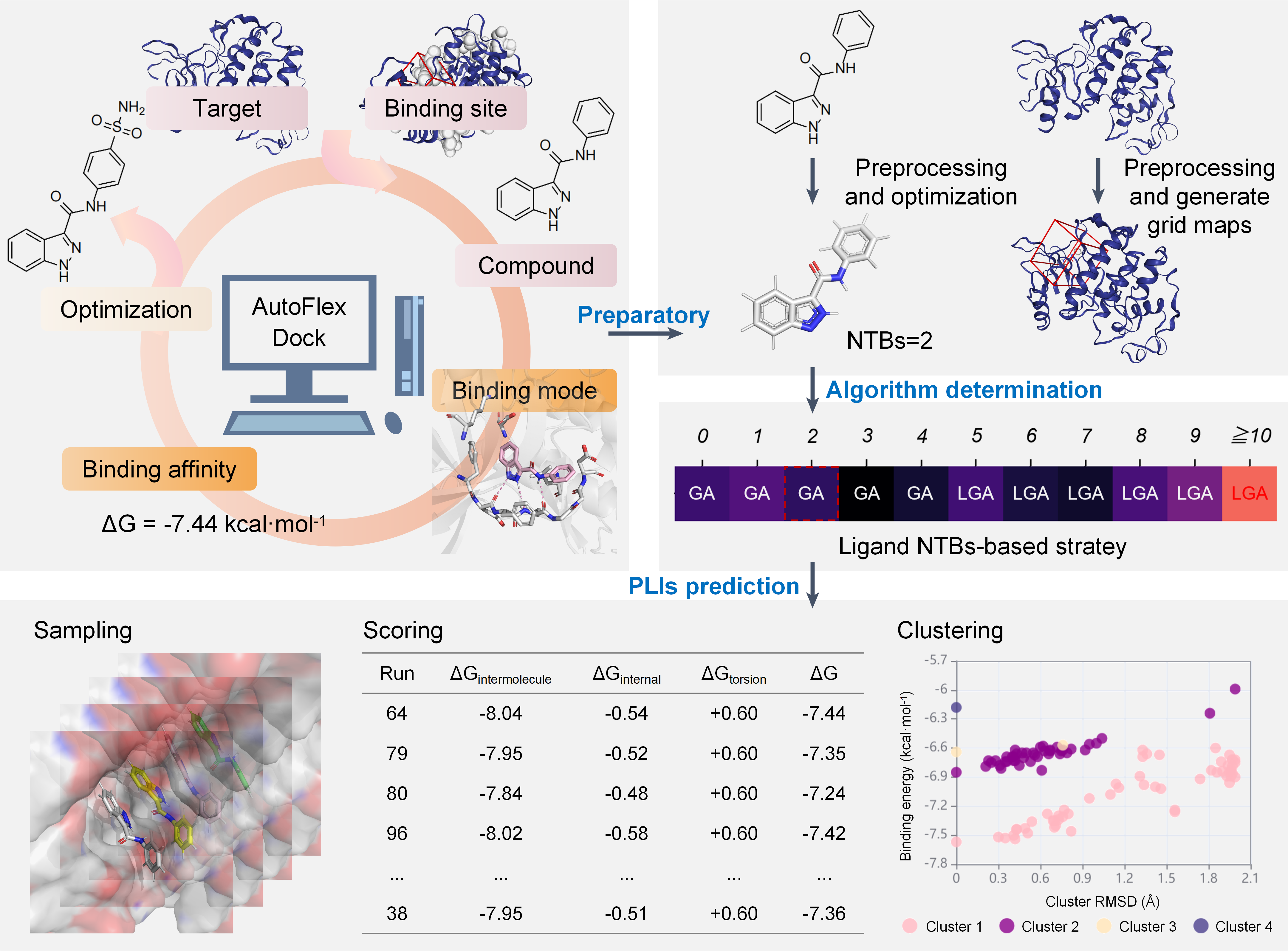 In AutoFlex-Dock, AutoDock docking engine, number of torsion bonds (NTBs)-based strategy, binding free energy and multiple binding poses analysis are well integrated to improve the prediction efficiency of PLIs.