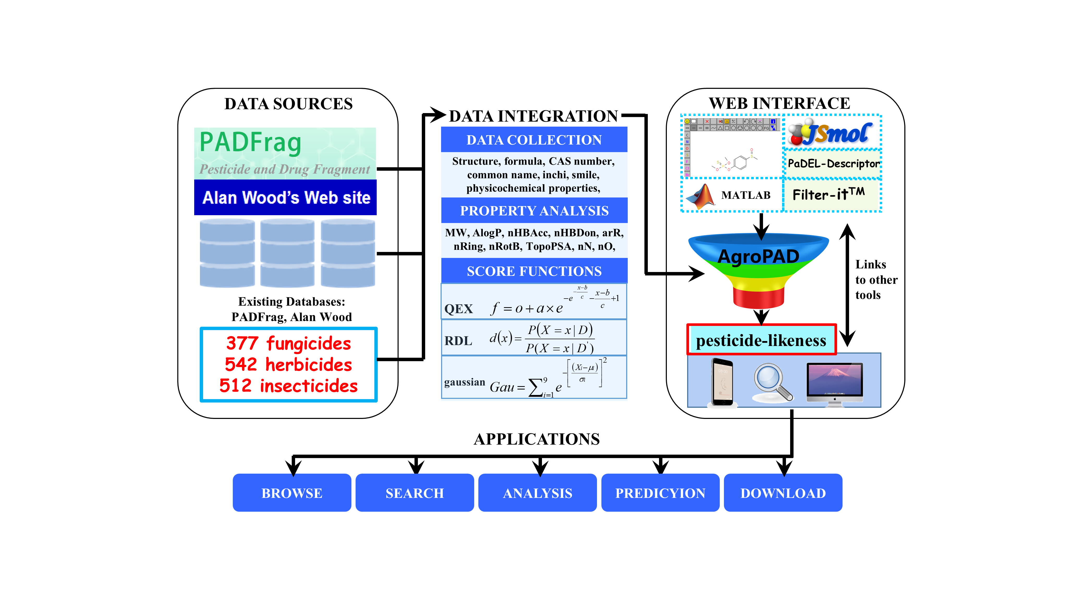 You can browse three classes of pesticides respectively. Structures and physicochemical properties of these molecules directly displayed in the Browse page, click ID-link to view more basic information(common name, IUPAC name, CAS number, smiles, inchi), physicochemical properties(MW, ALogP, AMR, nAromBond, CLogS, TopoPSA, nHBAcc, nHBDon etc.), qualitative analysis of small molecule’s physicochemical properties distribution and quantitative analysis of pesticide-likeness scores(insecticide-likeness scores, fungicide-likeness scores or herbicide-likeness scores).